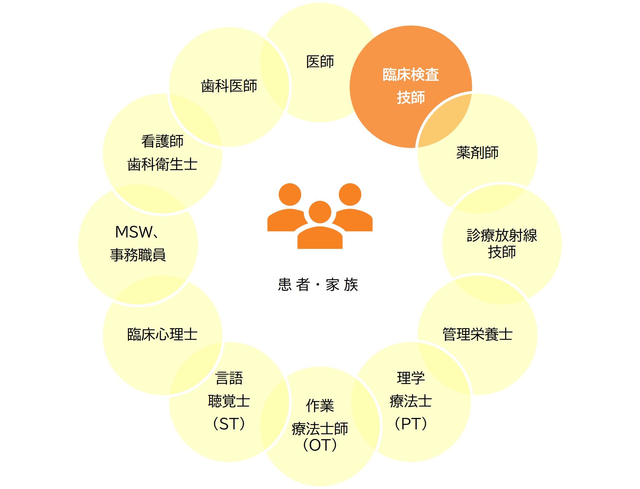 近年は医療の高度化や複雑化が進み、多くの病院で「チーム医療」が展開されています。チーム医療とは、さまざまな職種の医療スタッフがお互いに専門性を活かして連携しあうことで、個々の患者さんに最適な治療をおこなうことです。臨床検査技師は検査室にこもって試験管を振っているイメージがあるかもしれませんが、病棟で患者さんに直接触れて心電図検査などをおこなうのも臨床検査技師の役割です。また、検査データを調べて提供するだけではありません。臨床検査技師が関わっているチームとその業務内容を紹介します。