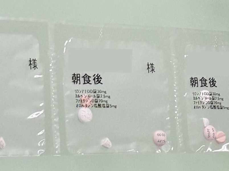 入院患者さんの内服薬は、持参薬を含めて一包化調剤(服用方法に応じて1回分ずつ分包すること)を行っています。また経管栄養を行っている患者さんには、簡易懸濁法に対応した調剤を行っています。